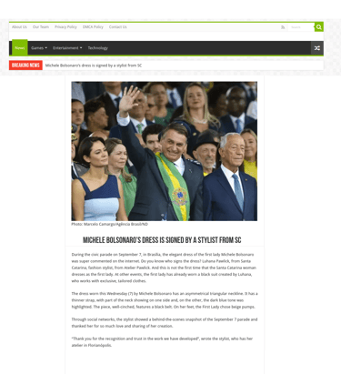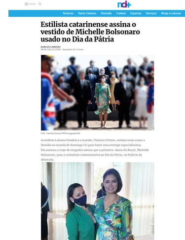 O vestido carrega a tradicional moulage Pawlick, a mesma já utilizada em outras vestimentas dos eventos oficiais figurados pela Primeira-Dama do Brasil, Michelle Bolsonaro.
