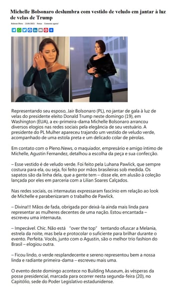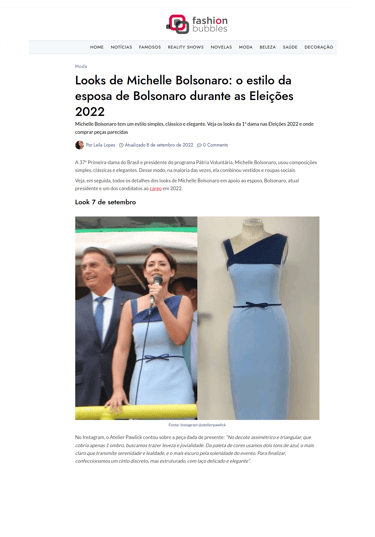 A tradicional moulage Pawlick do vestido, foi a mesma já utilizada em outras vestimentas de eventos oficiais e de Estado, figurados por Michelle Bolsonaro.