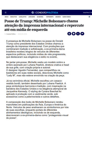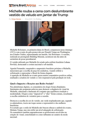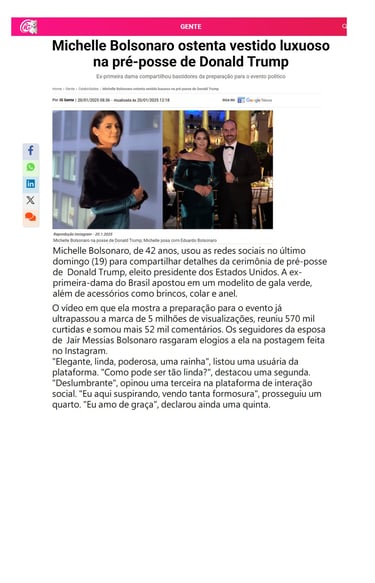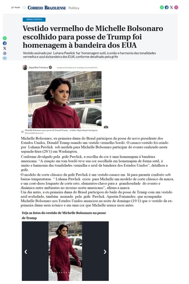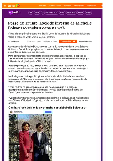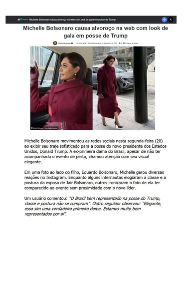 O evento principal da posse de Donald Trump como 47º presidente dos Estados Unidos destacou-se como uma das solenidades mais noticiadas nos últimos meses. Entre os convidados ilustres e chefes de Estado de todo o mundo, Michelle Bolsonaro teve uma presença marcante, representando seu marido, o ex-presidente do Brasil, Jair Bolsonaro.