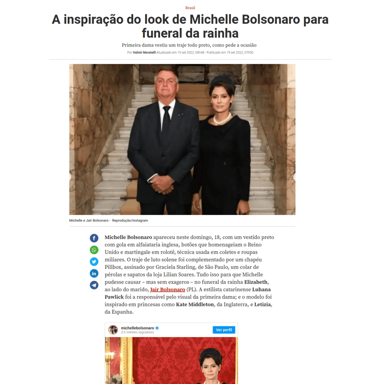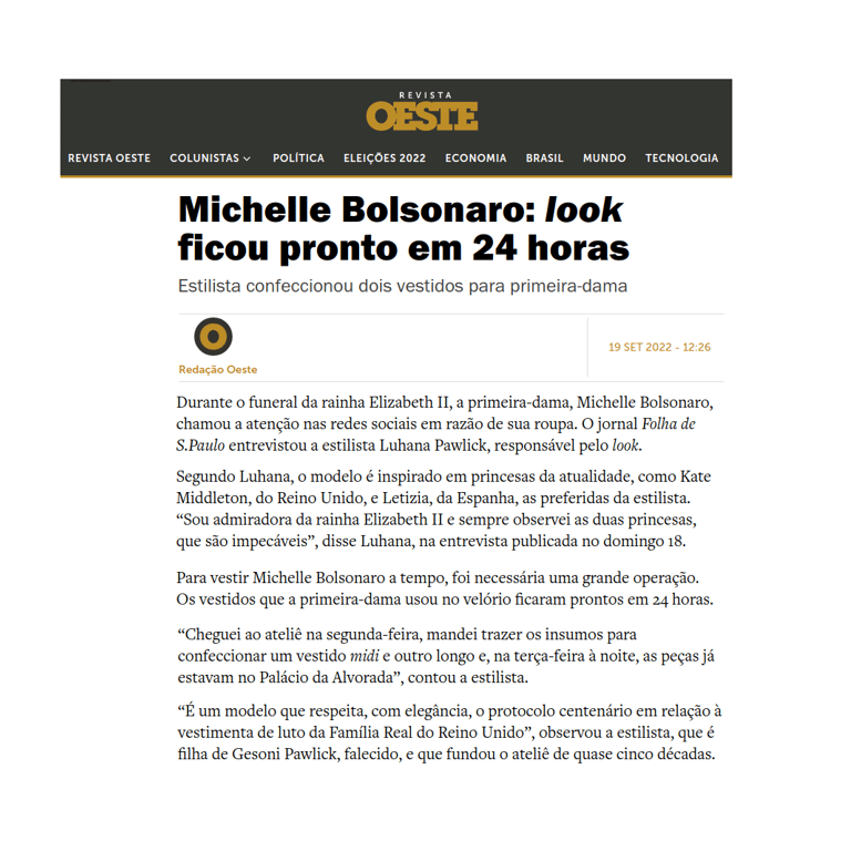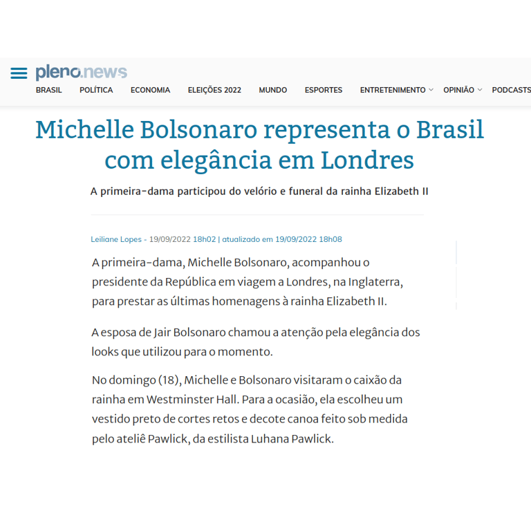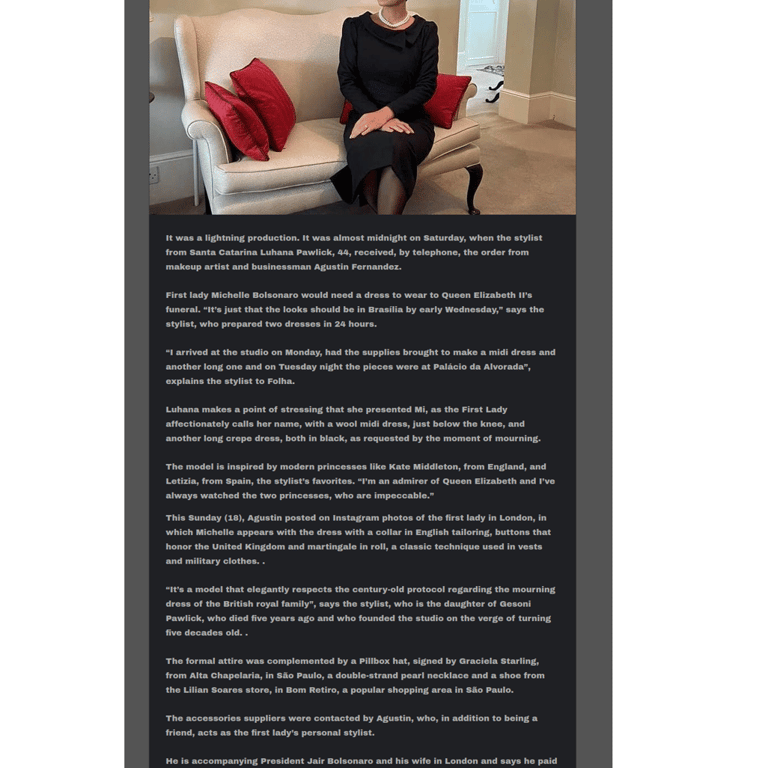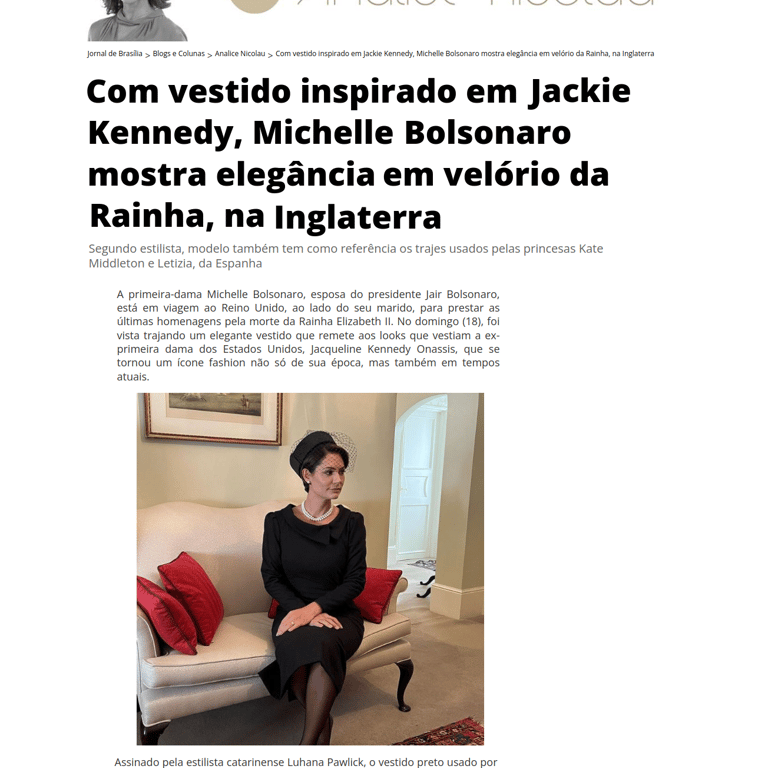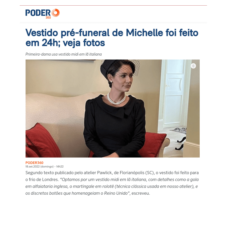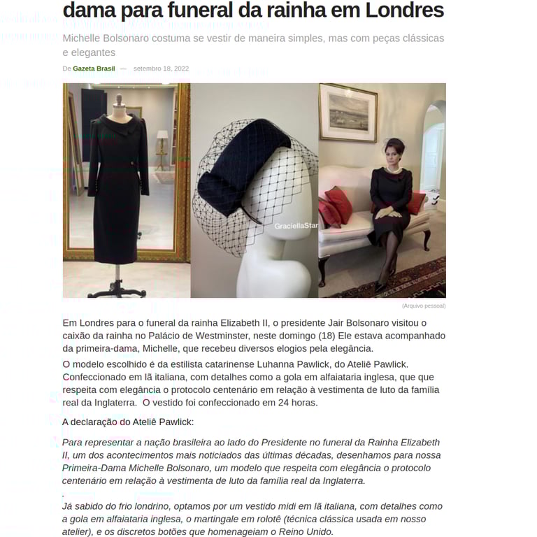 Para representar a nação brasileira ao lado do Presidente no funeral da Rainha Elizabeth II, um dos acontecimentos mais noticiados das últimas décadas, desenhamos para nossa Primeira-Dama Michelle Bolsonaro, um modelo que respeita com elegância o protocolo centenário em relação à vestimenta de luto da família real do Reino Unido.
