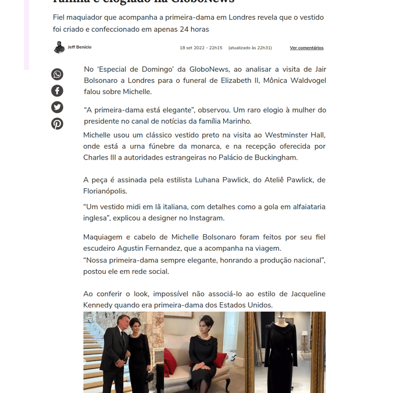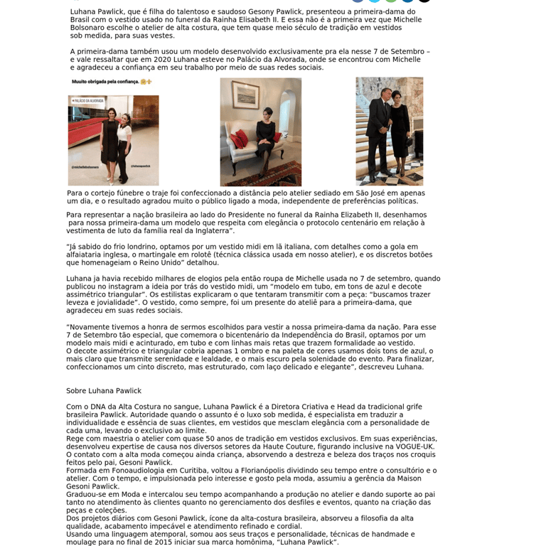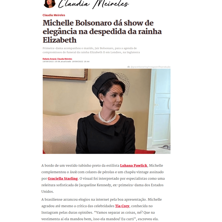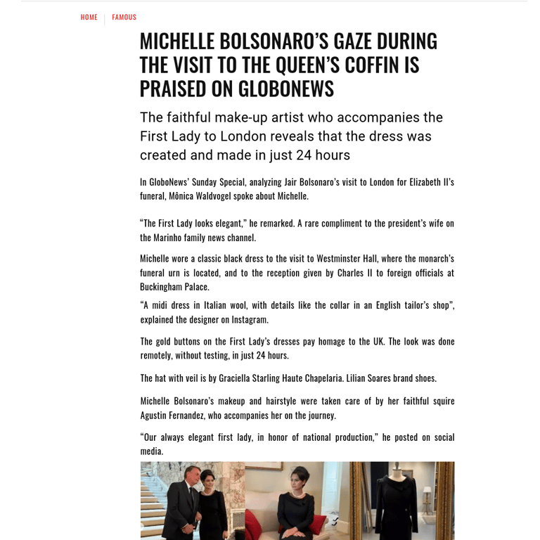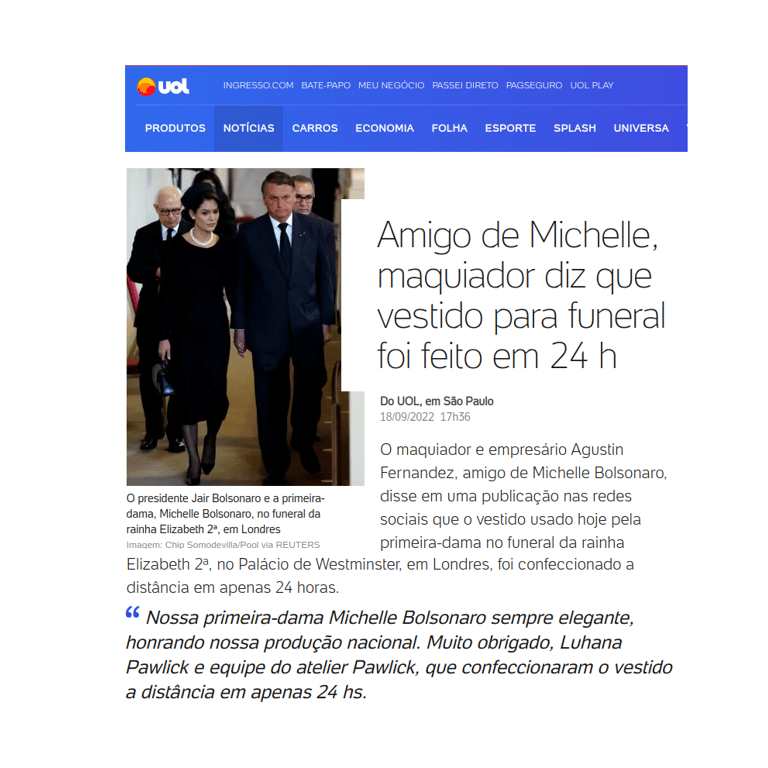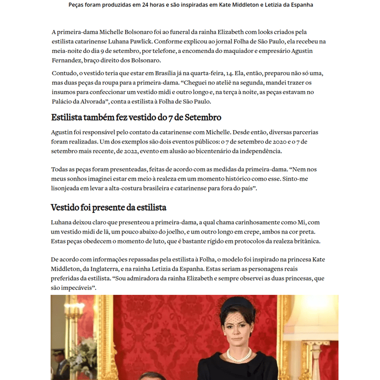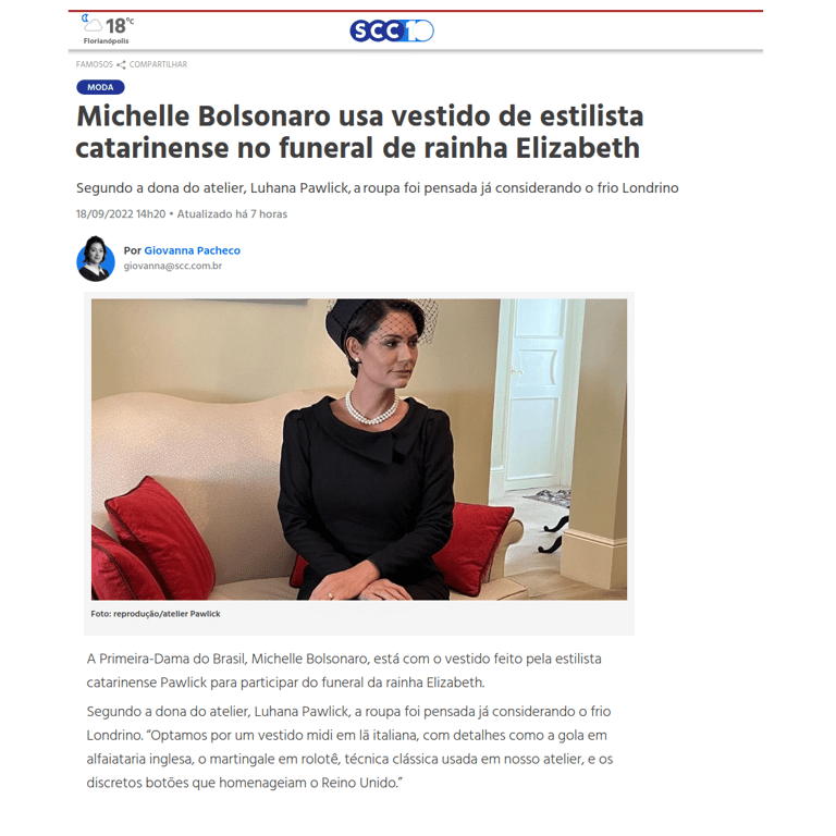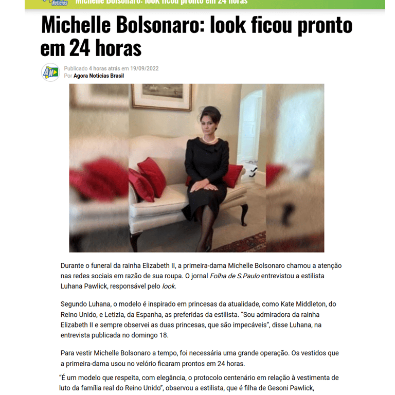 Para representar a nação brasileira ao lado do Presidente no funeral da Rainha Elizabeth II, um dos acontecimentos mais noticiados das últimas décadas, desenhamos para nossa Primeira-Dama Michelle Bolsonaro, um modelo que respeita com elegância o protocolo centenário em relação à vestimenta de luto da família real do Reino Unido.