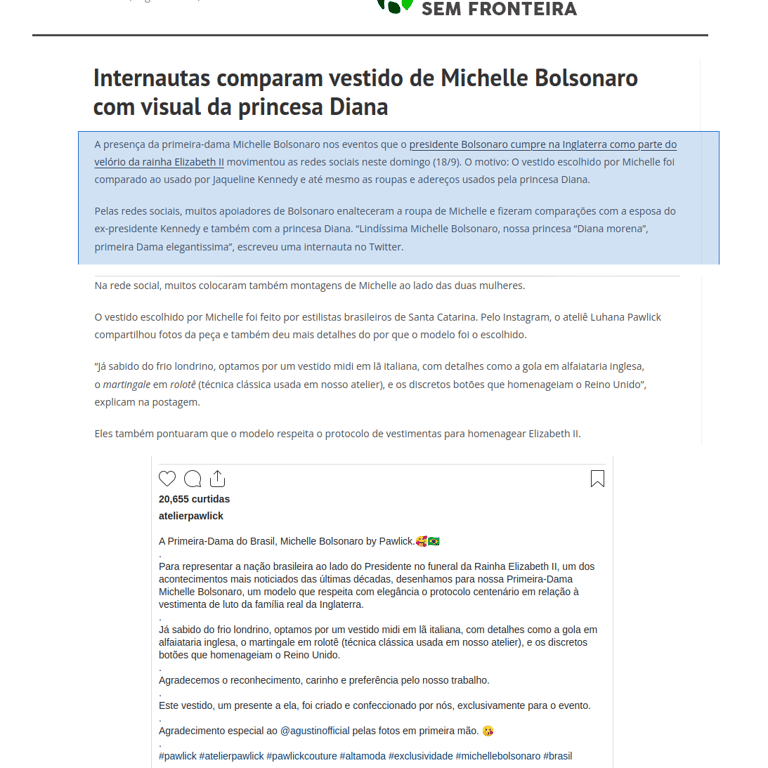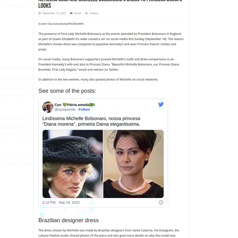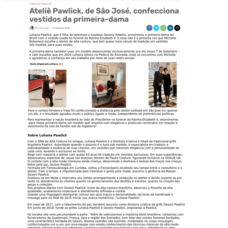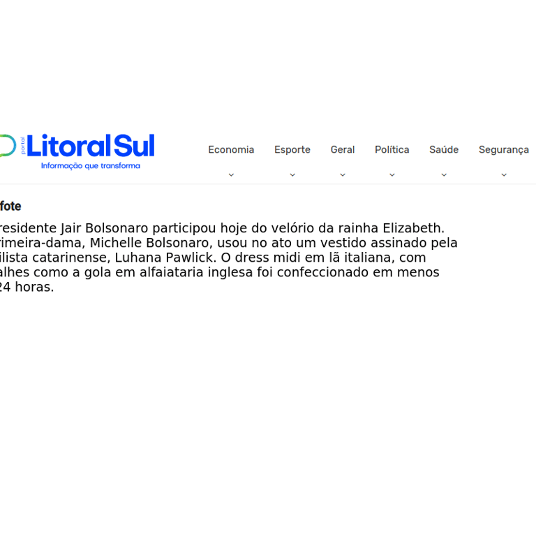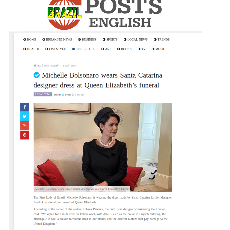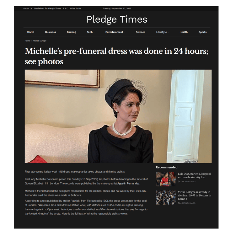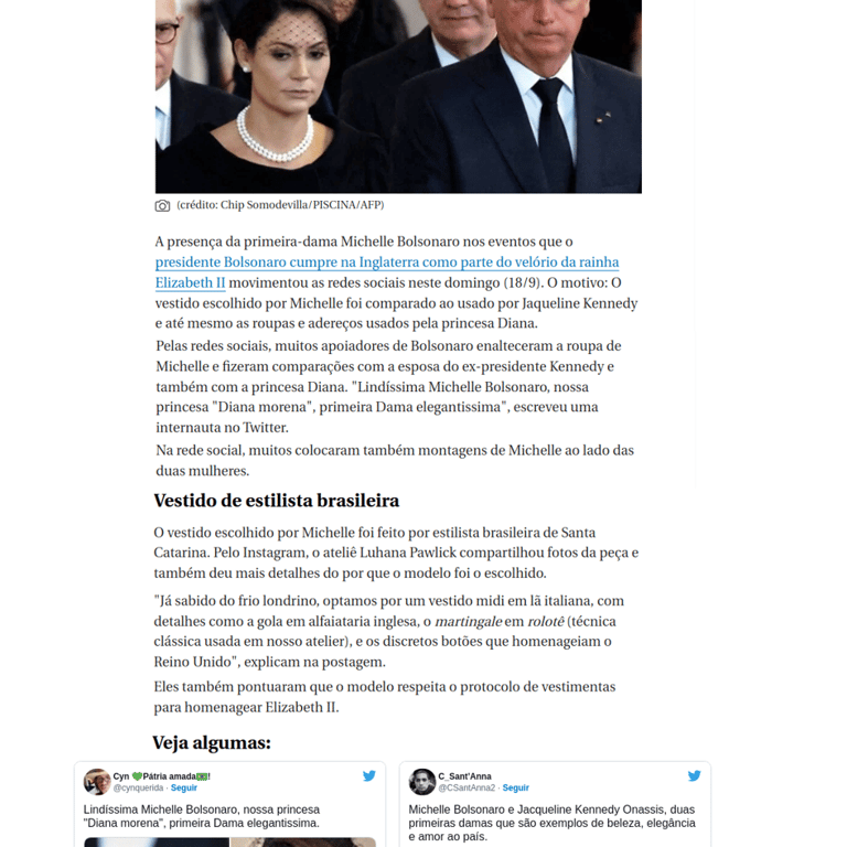 Para representar a nação brasileira ao lado do Presidente no funeral da Rainha Elizabeth II, um dos acontecimentos mais noticiados das últimas décadas, desenhamos para nossa Primeira-Dama Michelle Bolsonaro, um modelo que respeita com elegância o protocolo centenário em relação à vestimenta de luto da família real do Reino Unido.